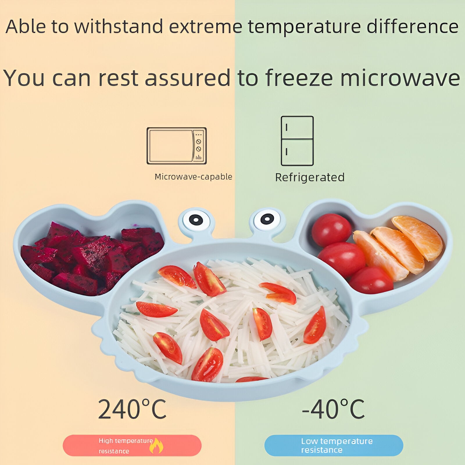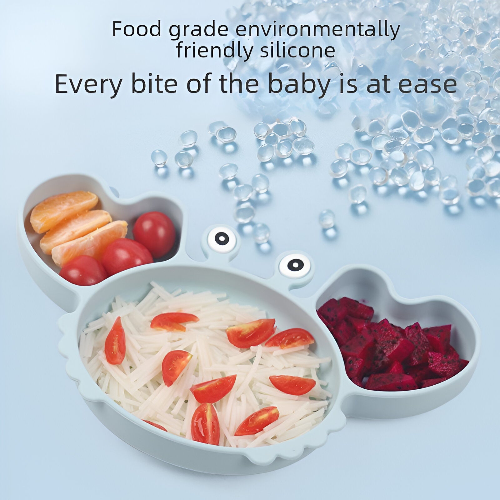 Make mealtime fun and mess-free with this adorable crab-shaped silicone dinner plate set! Designed with strong suction to prevent spills, it features a two-color design, divided sections for portion control, and baby-safe, BPA-free silicone. Ideal for infants and toddlers, this plate helps promote self-feeding while keeping food neatly in place. Perfect for home or travel use.