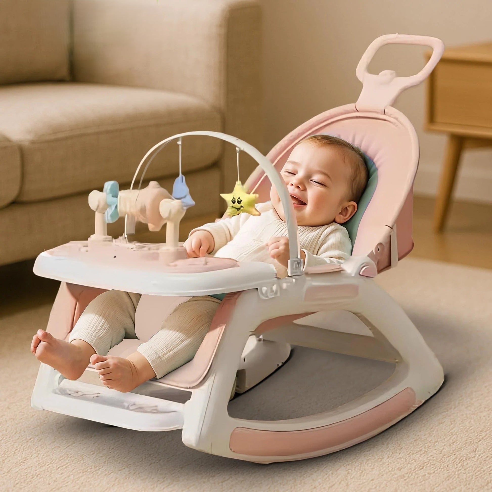 Give your little one the comfort and functionality they deserve with this 5-in-1 Baby Rocking Chair. Thoughtfully designed to adapt as your baby grows, this chair transitions from a soothing rocker to a secure booster seat and a fun playtime bouncer. With a detachable toy bar featuring soft hanging toys, mealtime and playtime become joyful experiences.